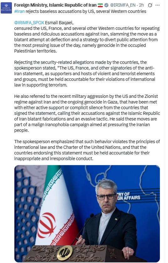 Esmail Baqaei, censured the US, France, and several other Western countries for repeating baseless and ridiculous accusations against Iran, slamming the move as a blatant attempt at deflection and a strategy to divert public attention from the most pressing issue of the day, namely genocide in the occupied Palestinian territories. Rejecting the security-related allegations made by the countries, the spokesperson stated, “The US, France, and other signatories of the anti-Iran statement, as supporters and hosts of violent and terrorist elements and groups, must be held accountable for their violations of international law in supporting terrorism. He also referred to the recent military aggression by the US and the Zionist regime against Iran and the ongoing genocide in Gaza, that have been met with either active support or complicit silence from the countries that signed the statement, calling their accusations against the Islamic Republic of Iran blatant fabrications and an evasive tactic. He said these moves are part of a malign Iranophobia campaign aimed at pressuring the Iranian people. The spokesperson emphasized that such behavior violates the principles of international law and the Charter of the United Nations, and that the countries endorsing this statement must be held accountable for their inappropriate and irresponsible conduct.