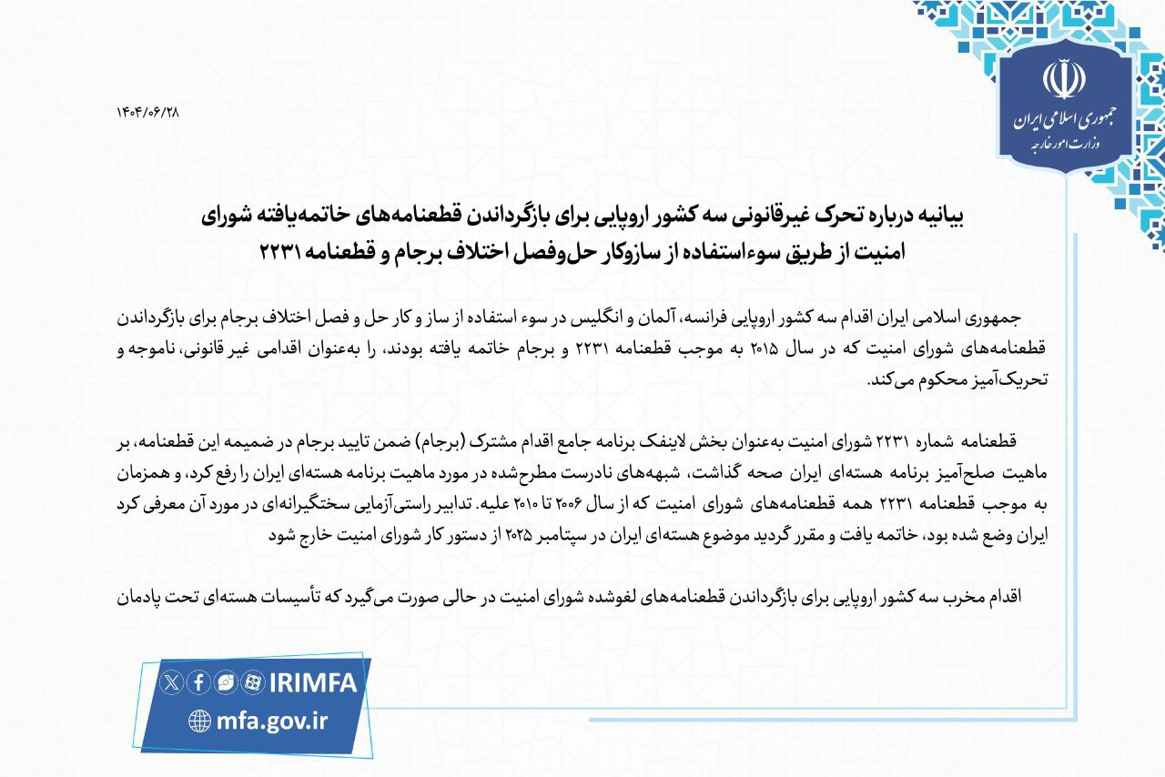 The Islamic Republic of Iran condemns as unlawful, unfounded, and provocative the attempt by France, Germany, and the United Kingdom to abuse the Joint Comprehensive Plan of Action (JCPOA) dispute resolution mechanism in order to reinstate Security Council resolutions that were terminated in 2015 under Resolution 2231 and the JCPOA.