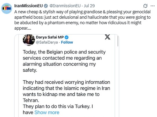 پاسخ نمایندگی جمهوری اسلامی ایران در بروکسل به اتهامات بی اساس نماینده پارلمان بلژیک در شبکه ایکس