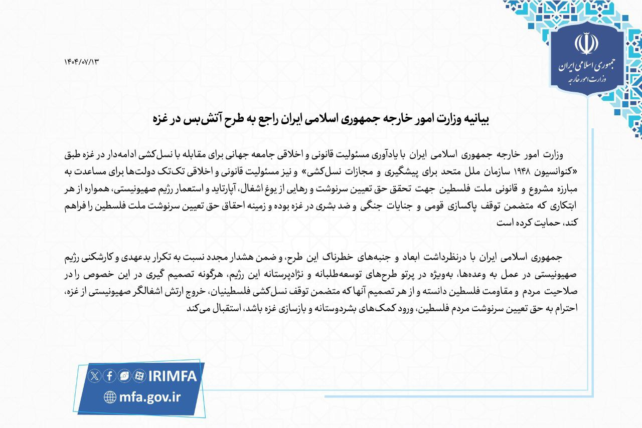 وزارت امور خارجه جمهوری اسلامی ایران با یادآوری مسئولیت قانونی و اخلاقی جامعه جهانی برای مقابله با نسل‌کشی ادامه‌دار در غزه طبق «کنوانسیون ۱۹۴۸ سازمان ملل متحد برای پیشگیری و مجازات نسل‌کشی» و نیز مسئولیت قانونی و اخلاقی تک‌تک دولت‌ها برای مساعدت به مبارزه مشروع و قانونی ملت فلسطین جهت تحقق حق تعیین سرنوشت و رهایی از یوغ اشغال، آپارتاید و استعمار رژیم صهیونیستی، همواره از هر ابتکاری که متضمن توقف پاکسازی قومی و جنایات جنگی و ضد بشری در غزه بوده و زمینه احقاق حق تعیین سرنوشت ملت فلسطین را فراهم کند، حمایت کرده است.
